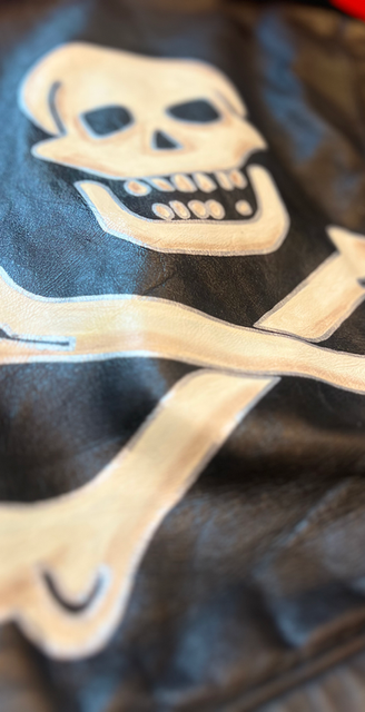Replica of the vintage biker jacket worn by rockabilly guitar icon, Bryan Setzer, with added metal swagger and pirate paraphernalia! This is a hand painted piece with additional application to give the sleeve flames an aged, vintage look.